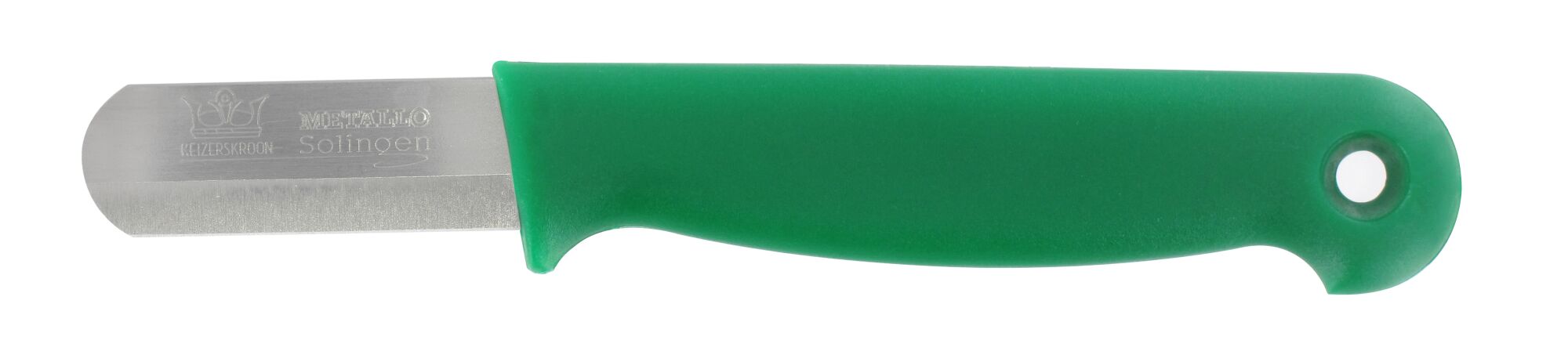 De Metallo 956008-D is een licht, vlijmscherp en duurzaam oogstmes van hoogwaardig bandstaal met een 45 mm lemmet en afgeronde punt. Ontwikkeld voor professioneel gebruik in de glastuinbouw, ideaal voor het oogsten van paprika’s, komkommers en tomaten. De dubbele slijping garandeert langdurige scherpte en een zuivere snede zonder de vrucht te beschadigen. Het ergonomische groene handvat ligt comfortabel in de hand en is goed zichtbaar tussen het gewas. De messen zijn los verpakt, zonder onnodige individuele verpakkingen, in een efficiënte bulkdoos van 500 stuks. Zo besparen telers verpakkingsmateriaal, transportvolume en dragen ze actief bij aan een lagere milieubelasting.