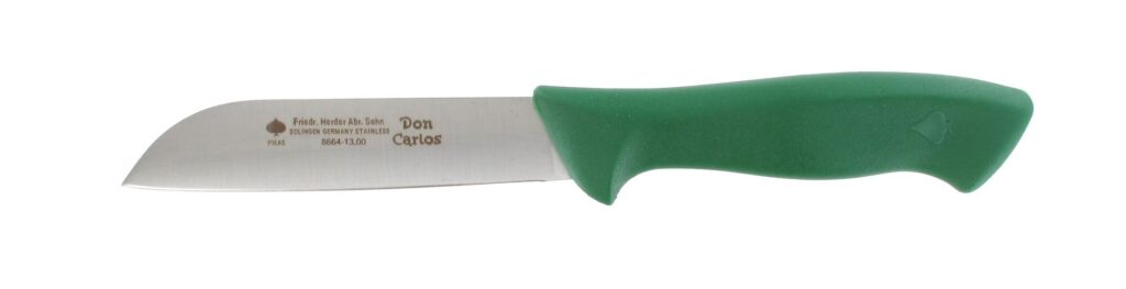 De Friedrich Herder F8664J is een professioneel mes uit Solingen met een 130 mm RVS lemmet. Dit veelzijdige mes wordt veel gebruikt als kopmes, koolmes of panmes en is uitermate geschikt voor uiteenlopende werkzaamheden in de voedingsindustrie, landbouw, tuinbouw en productieomgevingen. Dankzij het scherpe en duurzame roestvrijstalen lemmet levert het uitstekende snijprestaties, zelfs bij intensief gebruik. Het groene ergonomische kunststof handvat met antislipstructuur zorgt voor een veilige en stabiele grip.