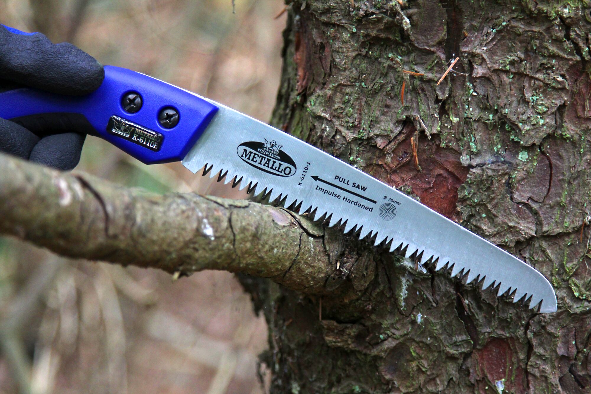 De Metallo K-6110B is een Blue-Line snoeizaag met recht zaagblad, impulsgeharde tanden en 3-voudige slijping. Deze zaag levert een vlijmscherpe snede en is ideaal voor gecontroleerd en precies zagen. Een recht blad is perfect geschikt voor horizontaal snoeiwerk of goed bereikbare takken, omdat je maximale controle hebt over de zaagbeweging en de zaagsnede. De impulsgeharde tanden zorgen voor een lange levensduur en blijven tot drie keer langer scherp dan traditionele zagen. De aanbevolen zaagdikte is circa 80 mm. De totale lengte is 350 mm en het blad is 180 mm lang. De zaag wordt standaard geleverd met een gratis holster.